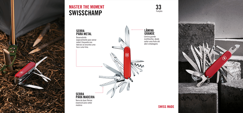 Ao escutar as palavras canivete do exército suíço, é bem provável que você se lembre do lendário canivete do soldado ou canivete militar. E a lenda continua com o canivete de bolso Swiss Champ. Ele é o máximo em canivete de bolso, oferecendo nada menos que 33 funções e possibilidades ilimitadas. Esteja onde você estiver e aconteça o que acontecer, se algo pode ser consertado, isso será feito com o Swiss Champ. O canivete Multiuso é ótimo para levar em qualquer lugar já que suas 33 funções te ajudam em tudo, abrir garrafas, limpar as unhas, lixar as unhas, gancho para várias ultilidades e muito mais. O canivete suíço ainda conta com a caneta esferográfica pressurizada te previnindo em qualquer lugar que vá. Compre online o autêntico canivete de bolso Victorinox!